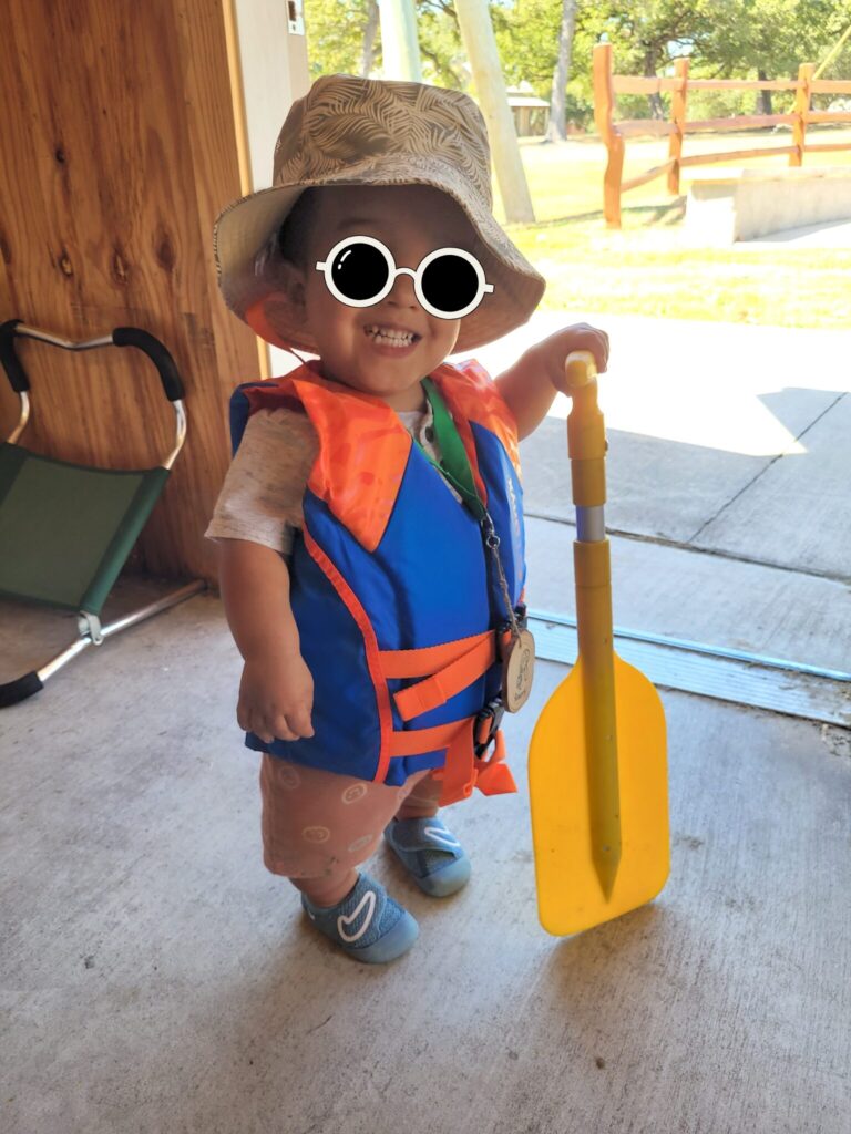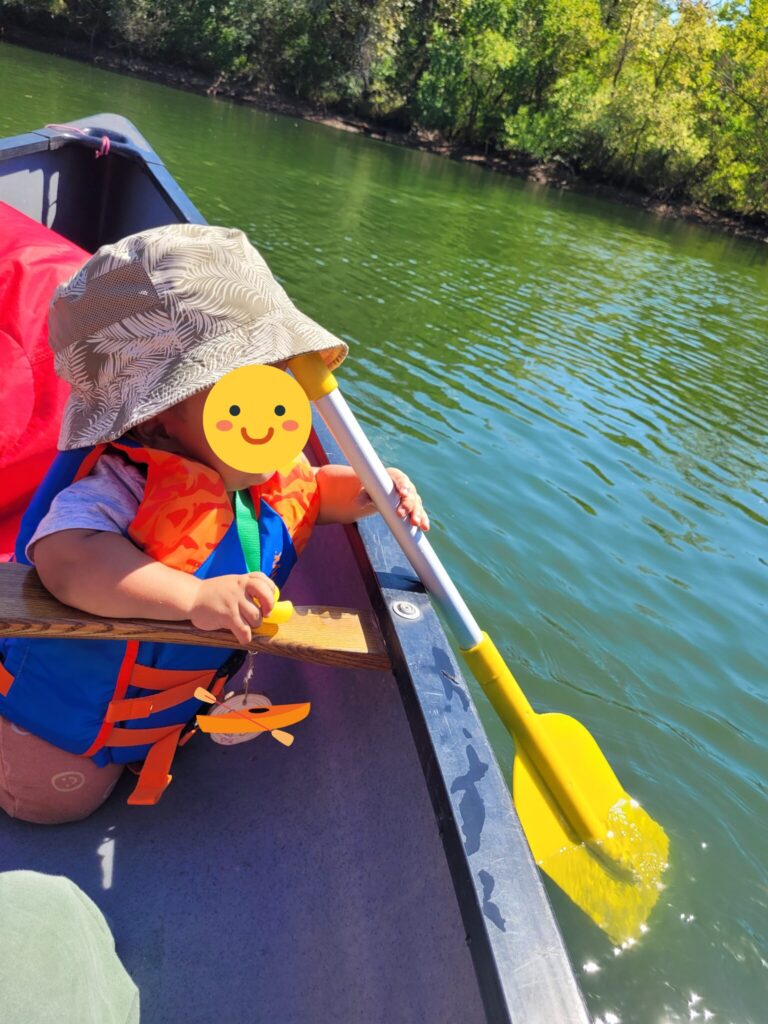 ファミリータイム②では選択できるアクテビティの中で子供たちがカヌーをやりたいというのでカヌーをやることに…モーリーは今回のキャンプでは最年少の参加者でしたし、まだ歩き始めたばかりで安定しない歩行のため、できるアクティビティは限られるだろうと思ってました。