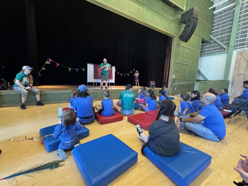 キャンプスタッフの皆さんが色々準備をしてくださっていて、打楽器のたたき方、リボンダンス、バランスパフォーマンスなどいろいろ教えてくれながら子供たちと遊びました。